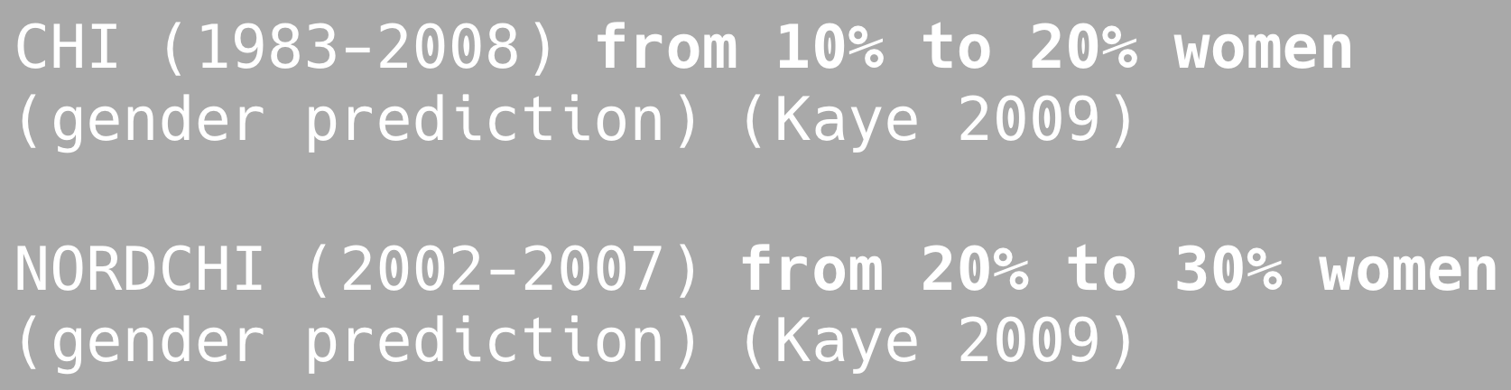 Given that NIME started as a spin-off workshop from the Computer-Human Interaction (CHI) conference, we compare these results with human-computer interaction (HCI) conferences. In particular, if we look at CHI, we realize that there is a reported improvement from 10% to 20% of women authors over the course of 26 years. Even more presence of women authors and improvement over the course of the years is found in the Scandinavian conference NORDCHI, moving from 20% to 30% within 6 years. This indicates that an improvement is possible, and lessons need to be learned from these successful examples.