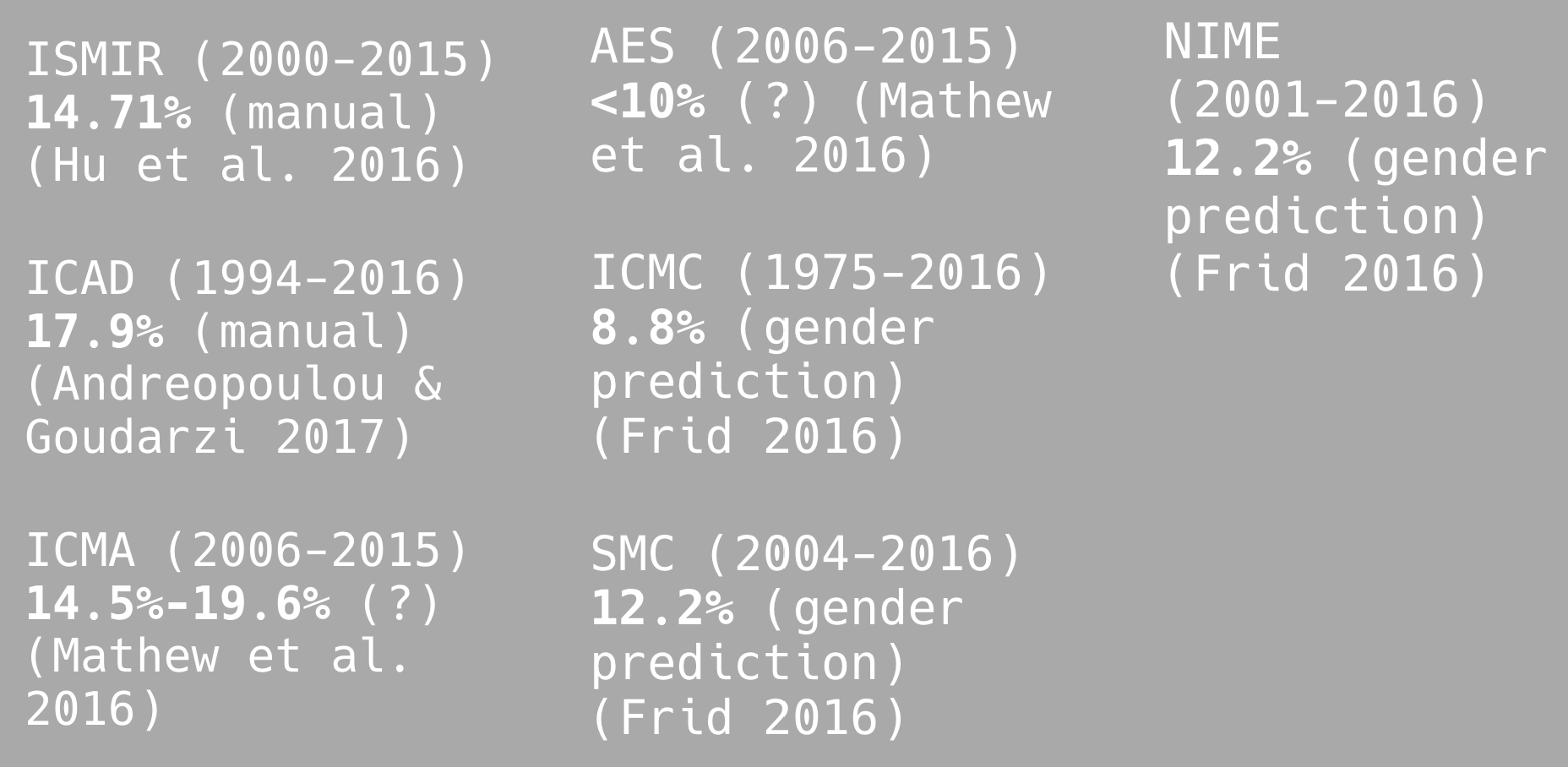 We compare this average percentage with the average percentages of other related communities. The goal is to get a sense of the level of similarity with its neighbor conferences, acknowledging that these other percentages have been calculated using different methods and the range of years varies. It is noteworthy that the result is consistent with similar communities, such as the International Computer Music Association (ICMA), with reported ranges between 14.5% and 19.6%, and the International Society of Music Information Retrieval (ISMIR), with a reported average percentage of 14.7%. The International Conference on Auditory Displays (ICAD) reports a better result of 17.9%, whilst Sound and Music Computing (SMC), the International Computer Music Conference (ICMC), and the Audio Engineering Society (AES) report 12.2%, 8.8%, and less than 10%, respectively.