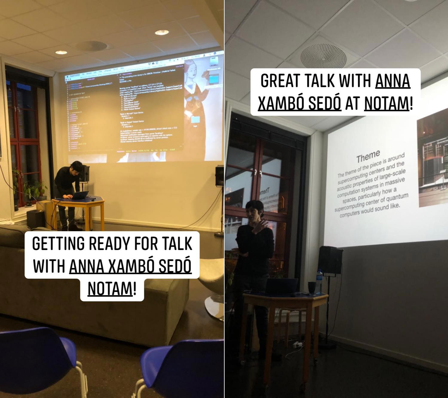 - Xambó, A. “A session on participatory mobile music and live coding using crowdsourced sounds”. NTNU Research Concert. Dokkhuset. Trondheim, Norway. November 24, 2018.