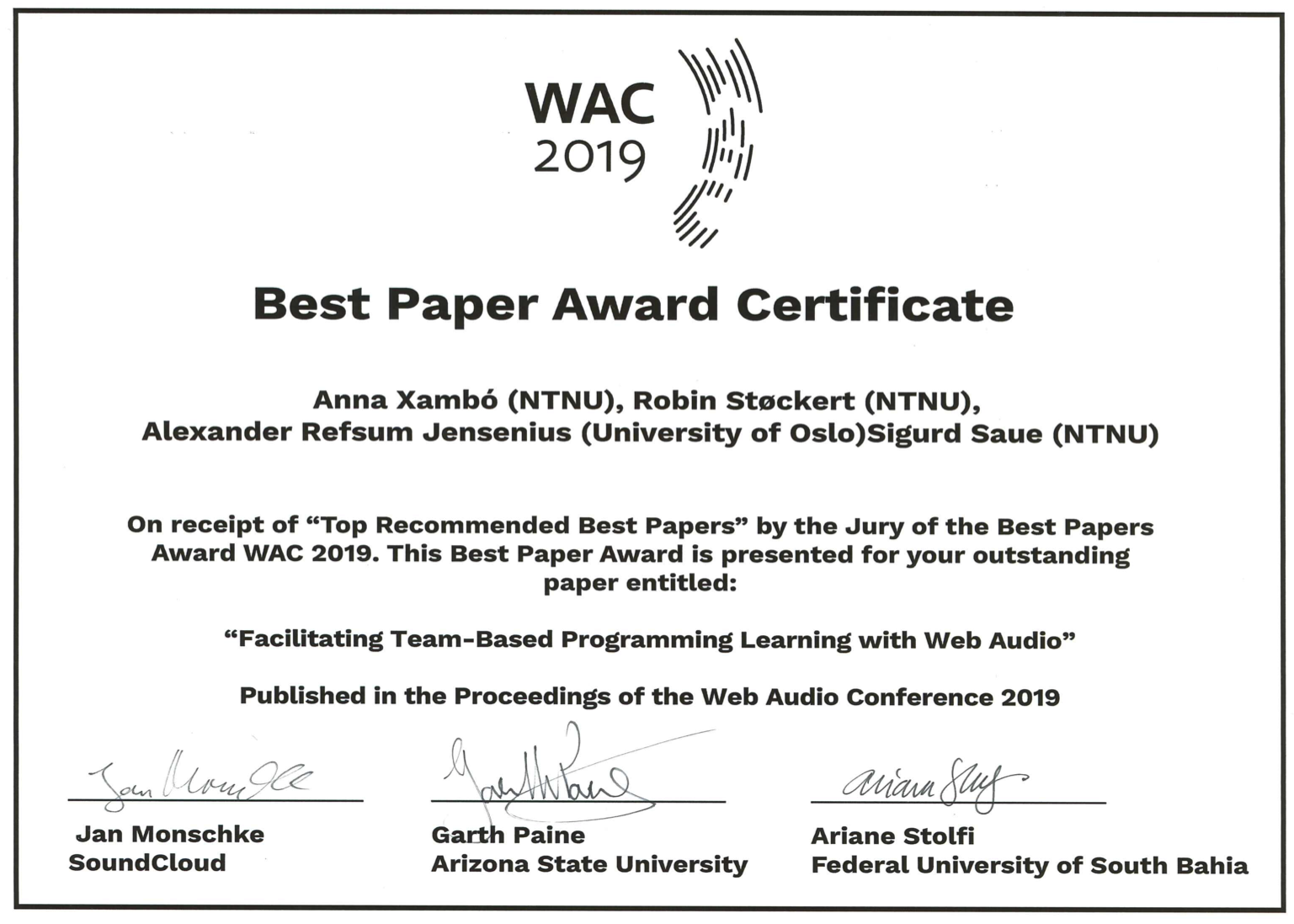 - Xambó, A., Støckert, R., Jensenius, A.R. and Saue, S. (2019) “Facilitating Team-Based Programming Learning with Web Audio”. In Proceedings of the Web Audio Conference 2019 (WAC ’19). Trondheim, Norway.