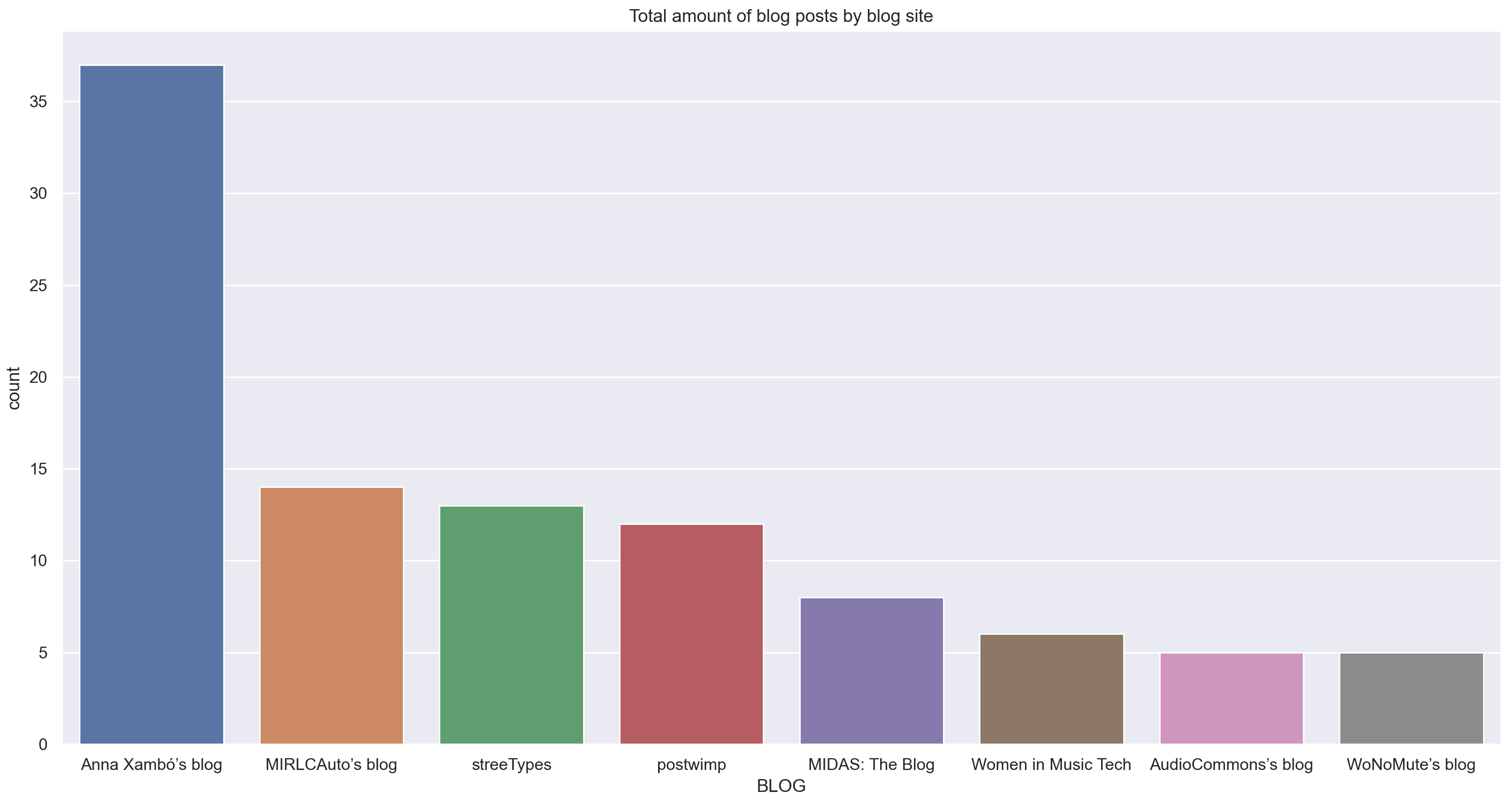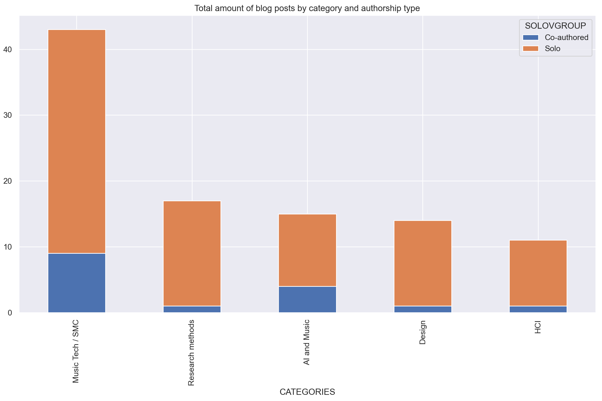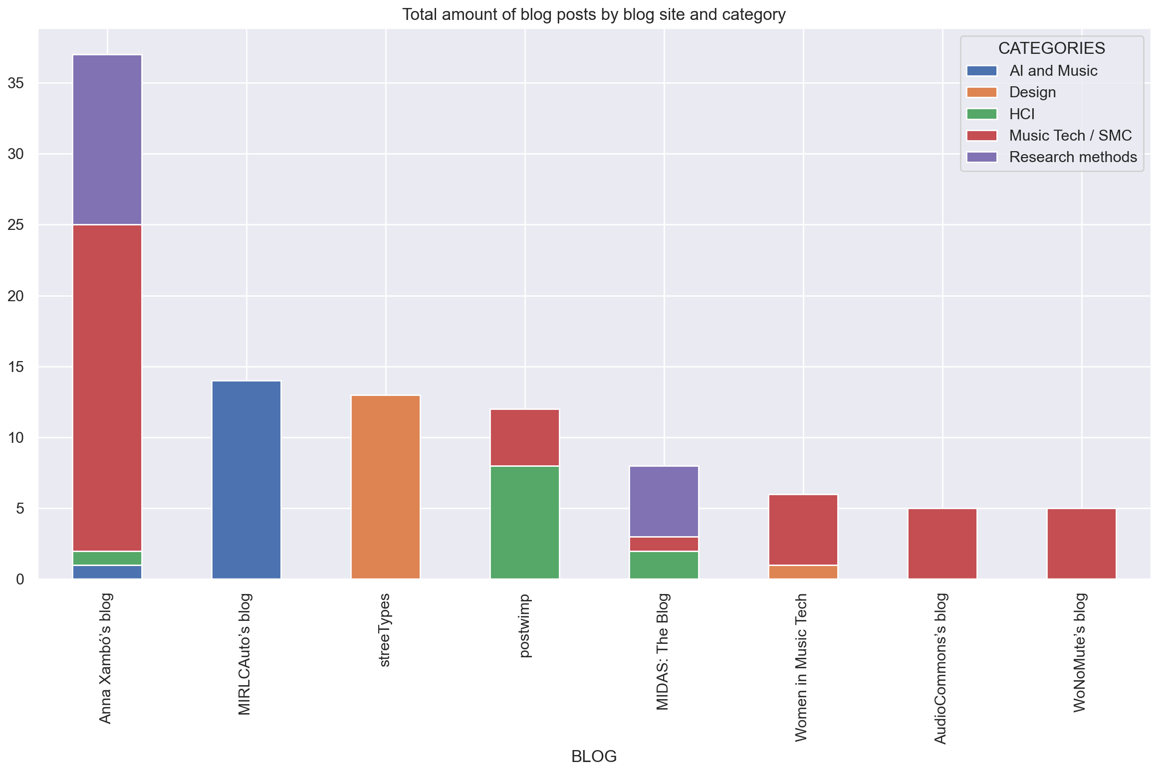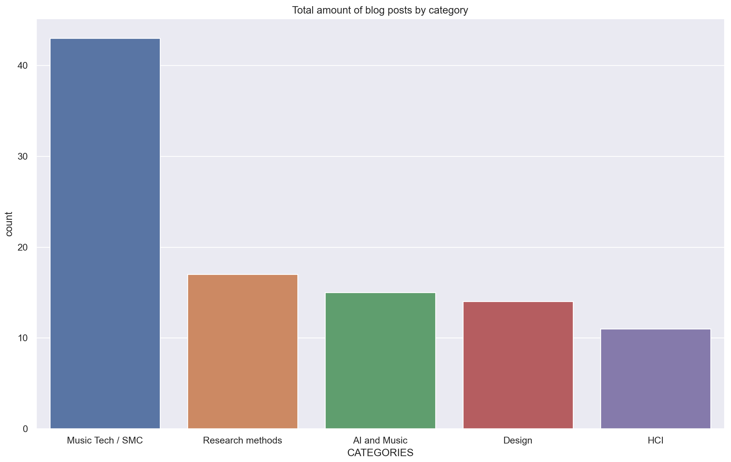 The blog posts can be classified within the categories of AI and music, music technology/SMC, HCI, design, and research methods. Figure 3 shows the total amount of blog posts by category. The most popular category is music technololgy / sound and music computing (SMC) with 43 blog posts. This is followed by the categories of research methods (17), AI and music (15), design (14) and HCI (11).