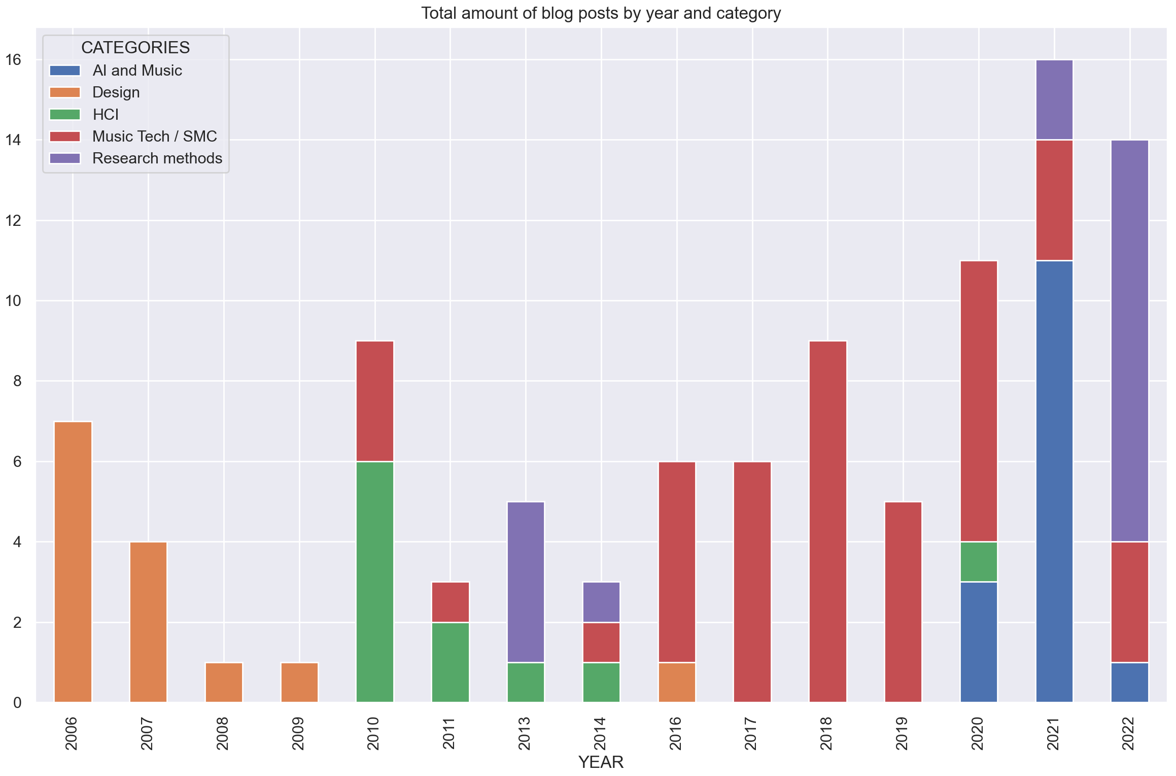 Figure 4 shows a stacked count plot of the total amount of blog posts by year and category. Design was the main topic between 2006-2009. HCI, music tech/SMC and research methods were the main topics between 2010-2014, which were the years of my PhD. Since 2016, the main topics have been music tech/SMC, combined with AI and music starting in 2020. Research methods have been also covered especially in 2022 while attending the DMU’s Future Research Leaders programme.