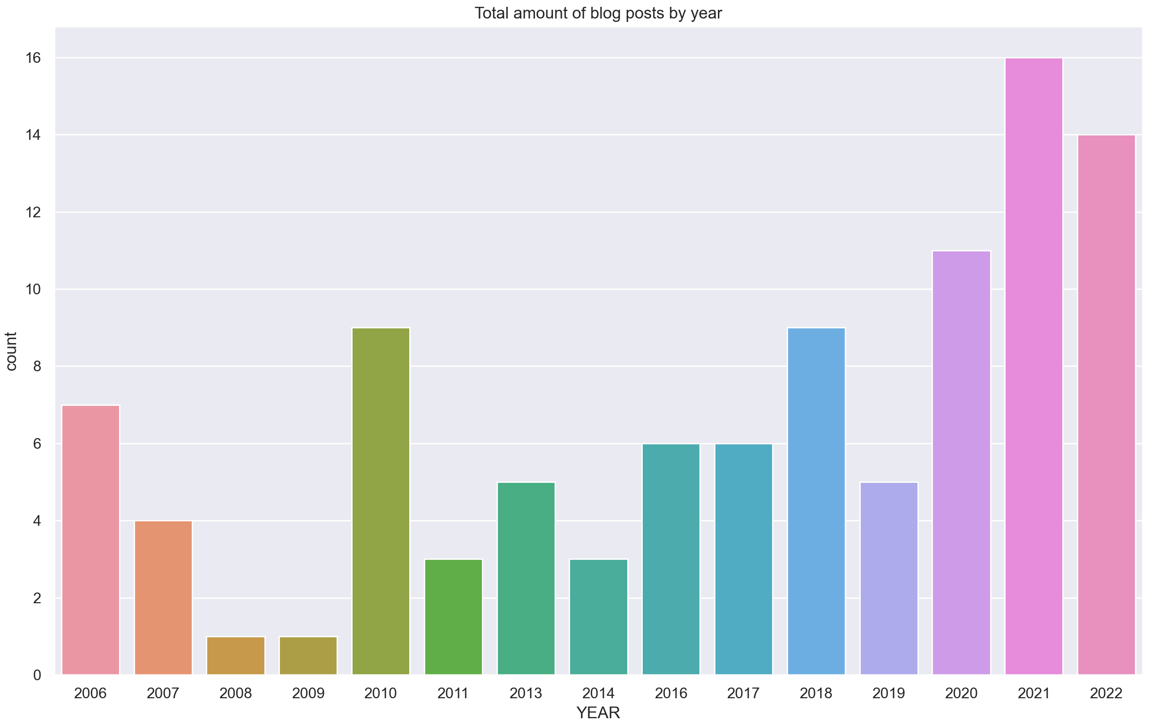 I wrote my first blog post in 2006 for my first blog named streeTypes, and I wrote here my 100th blog post in 2022. This is 16 years of blogging! Figure 2 shows a count plot of the total amount of blog posts by year, with an increasing trend. The year 2021 was especially fruitful writing a total of 16 blog posts. In the second position, there is 2022 with a total of 14 blog posts. A monthly blog post is my target for the upcoming months.