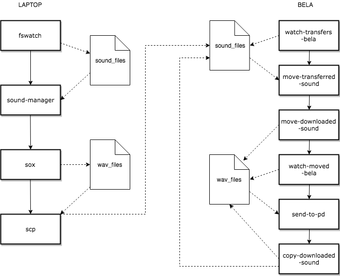 This part of the code aims at transferring downloaded audio files from the Internet in real time to the embedded Bela platform. The workflow is: (1) downloading an audio file from a laptop/desktop computer connected to the Internet, (2) convert the file to a .wav file, (3) transfer it to the embedded platform Bela, and (4) send it to a Pure Data (Pd) patch. This code assumes that the laptop and the Bela platform are both connected to the same network, which has access to the Internet.