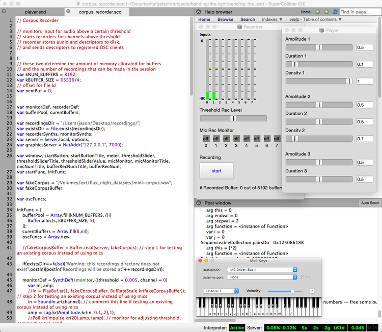 Description: Granular sampler for Flux Night 2015 is a collaborative project created especially for Jennifer Wen Ma’s Flux Night 2015 public art project, Bending the Arc. The Bending the Arc software is written in SuperCollider and is designed to listen to a voice, analyze that voice, then send what it learns to a graphics software so the voice can be animated in real-time. The Granular Sampler also records what it hears, and is able to recombine the voices it records and compose a musical mashup that can then be played back organized by pitch.