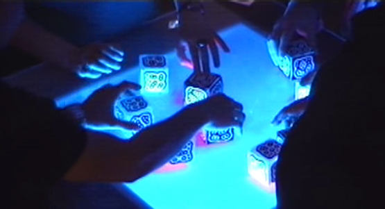 Description: SoundXY4 is an ambisonics system for music performance with a tangible interface. The system includes 6 white cubes, which each represents one of the 6 sound categories in Russolo’s “Art of Noise”. There are also black cubes, which represent filters that can modify the sound of the nearest white cube. The angle of the white cube on the table surface defines the position of the sound source in the room using ambisonics. SuperCollider is used for the visual feedback as well as for the audio engine and program logic.