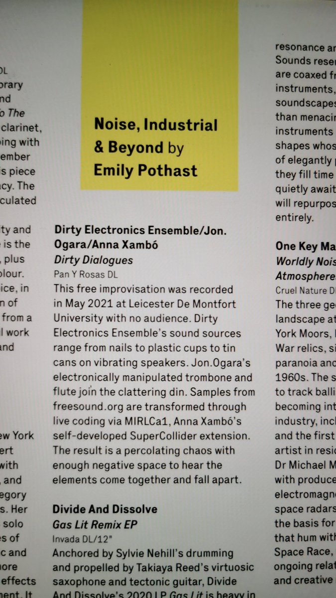 Review of Dirty Dialogues by Emily Pothast (2021 Rewind, The Wire 455, January 2022). About our live album “Dirty Dialogues” performed by Dirty Electronics Ensemble, Jon.Ogara and Anna Xambó.